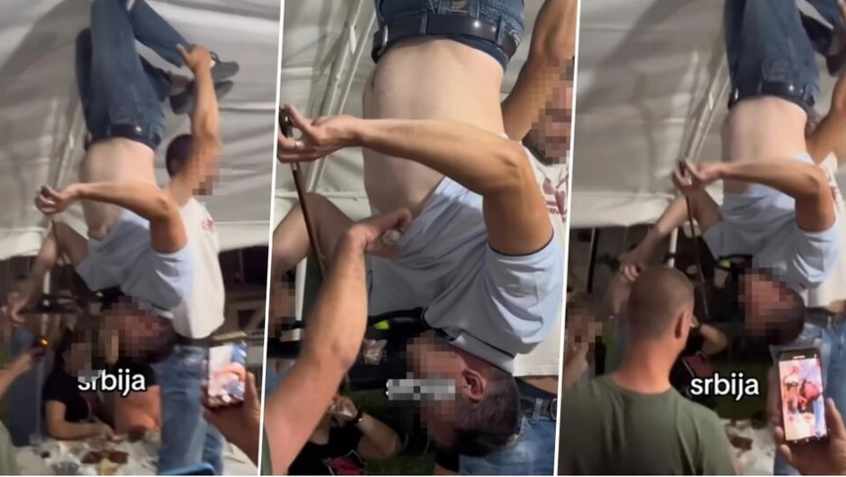 Naime, na video-snimku se vide gosti pod šatorom i muzičar koji visi naglavačke dok mu gosti daju novac, a on im svira.