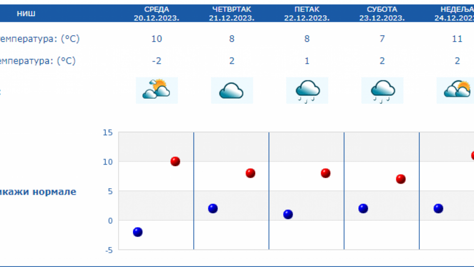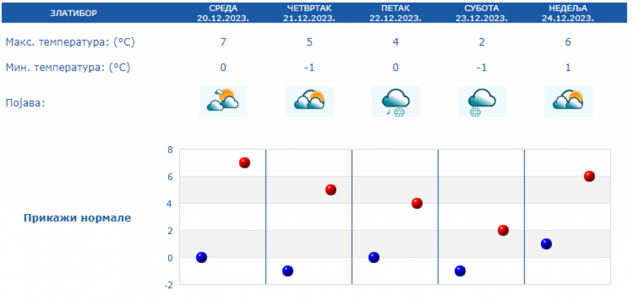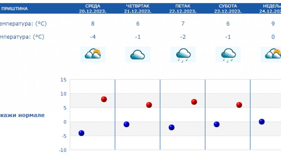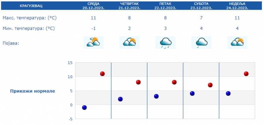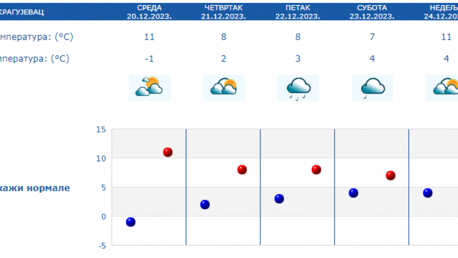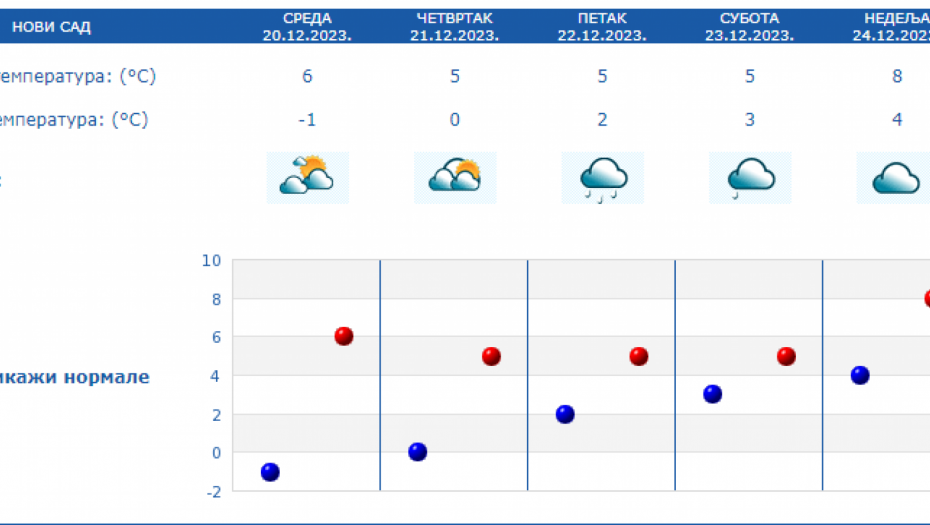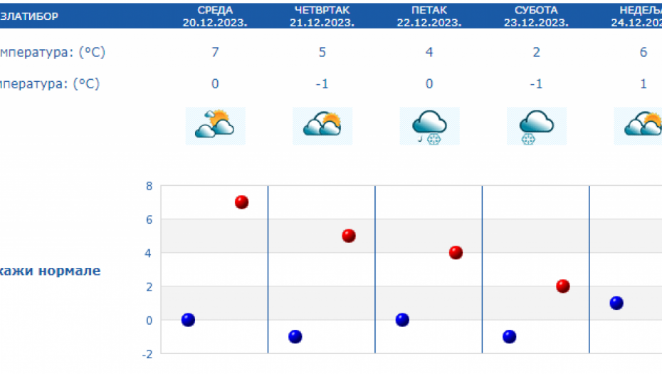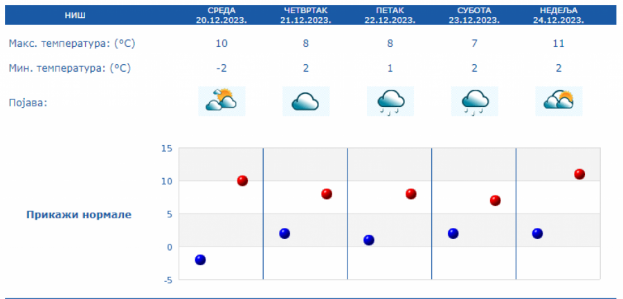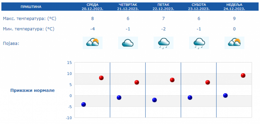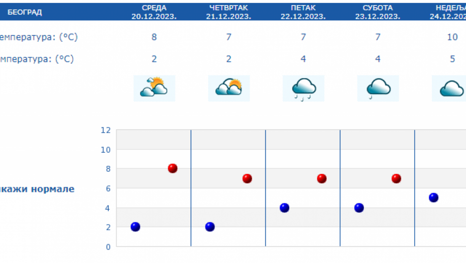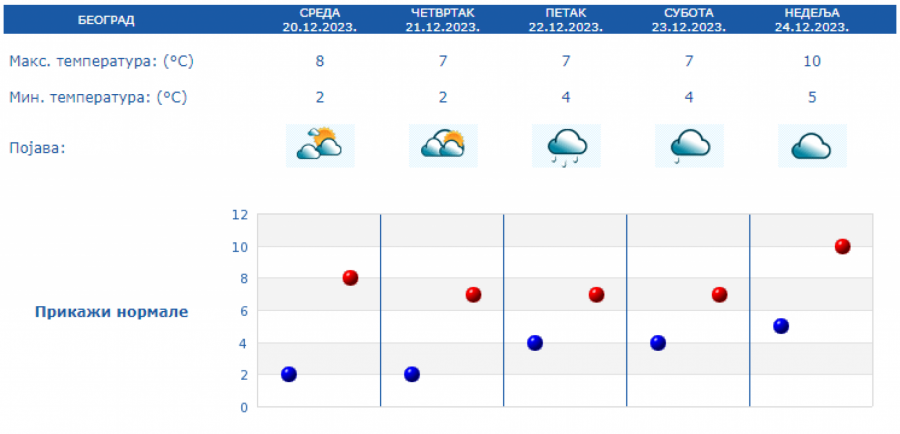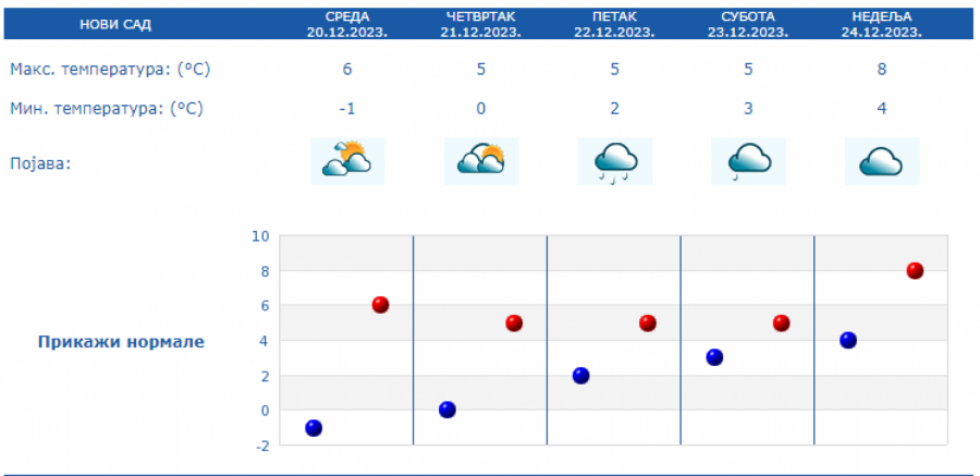 Pre podne će duvati slab južni, posle podne slab do umeren severozapadni vetar, sa temperaturama od minus pet do 12 stepeni.