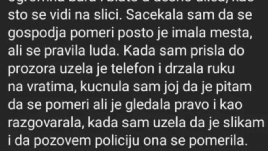 - Kada sam joj prišla do prozora, uzela je telefon i držala ruku na vratima, kucnula sam da je pitam da se pomeri, ali je gledala pravo i kao razgovarala. Kada sam uzela da je slikam i da zovem policiju ona se pomerila. Toliki bezobrazluk nisam videla u životu, pogotovo od jedne žene koja vidi da sam sa kolicima i da nemam gde da prođem - navela je ona.