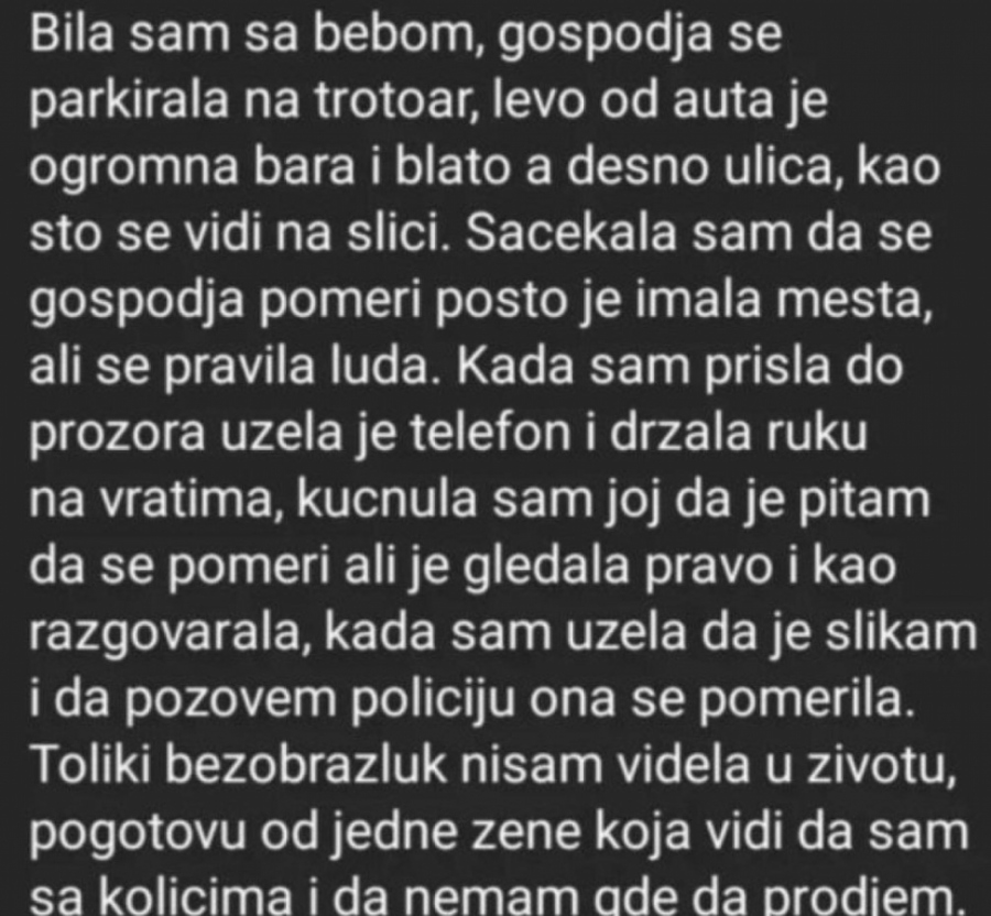 - Bila sam sa bebom, gospođa se parkirala na trotoar, levo od automobila je ogromna bara i blato, a desno ulica, kao što se vidi na slici. Sačekala sam da se gospođa pomeri pošto je imala mesta, ali se pravila luda - napisala je ova majka, a njena poruka objavljena je na storiju Instagram stranice "Moj_beo_grad_".