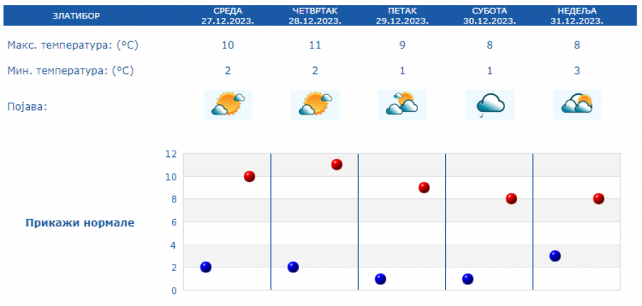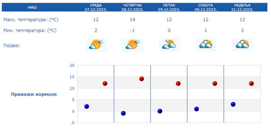 Prema prognozi Republičkog hidrometeorološkog zavoda, ujutro u nizijama, po kotlinama i duž rečnih dolina lokalna pojava magle ili niske oblačnosti, koja će se ponegde zadržati i delom prepodneva. Duvaće vetar uglavnom slab promenljiv, na istoku umeren zapadni.