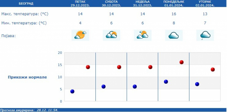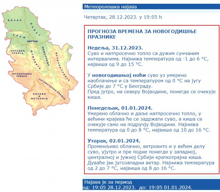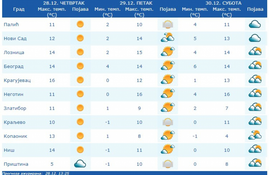U Srbiji će u petak, 29. decembra biti pretežno sunčano ili malo oblačno vreme i natprosečno toplo, sa temperaturama od minus tri do 16 stepeni, saopštio je Republički hidro-meteorološki zavod u vremenskoj prognozi za danas.
