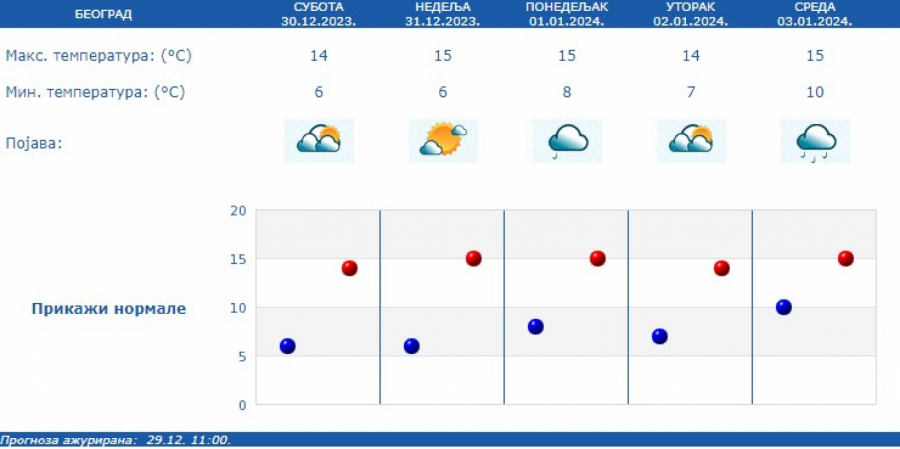 U Srbiji će u subotu, 30. decembra tokom dana biti umereno do potpuno oblačno na severu i zapadu tek ponegde sa kratkotrajnom kišom, a na jugu i jugoistoku Srbije sa dužim sunčanim intervalima, saopštio je RHMZ.