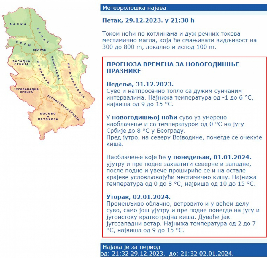 Ujutro se ponegde očekuje slab mraz, po kotlinama i duž rečnih tokova niska oblačnost ili magla.