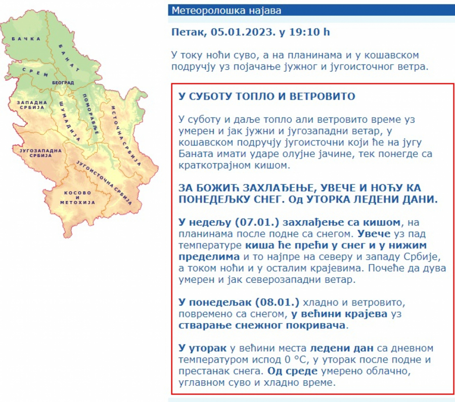 U utorak u većini mesta ledeni dan, posle podne uz prestanak snega. Od srede uglavnom suvo, uz umerene i jake jutarnje mrazeve, a danju umereno oblačno i hladno, sa temperaturom malo iznad 0 stepeni Celzijusa.