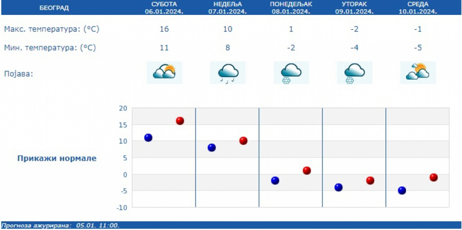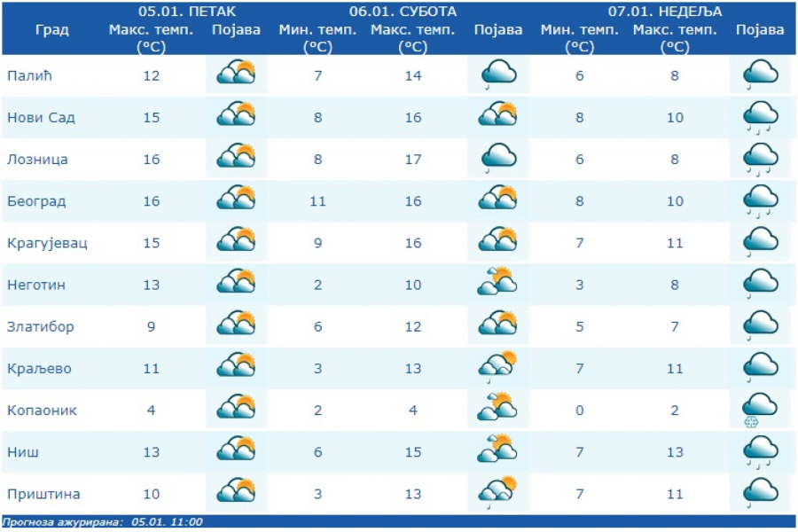 U Srbiji u nedelju oblačno, mestimično sa kišom, uz zahlađenje. Posle podne na planinama sneg, a uveče se uz pad temperature očekuje prelazak kiše u sneg i u nižim predelima, najpre na severu i zapadu Srbije, a tokom noći i u ostalim krajevima.