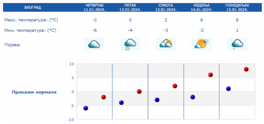 U Beogradu će biti oblačno, tmurno i hladno, ujutro i maglovito uz umeren, na širem području jak mraz. Duvaće slab, uveče i umeren zapadni vetar. Najniža temperatura od -10 do -6 °C, najviša oko -2 °C. U toku noći moguće provejavanje slabog snega.