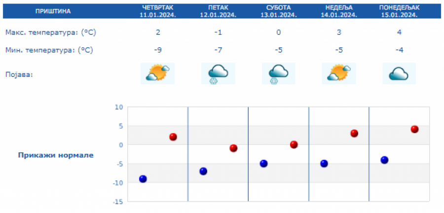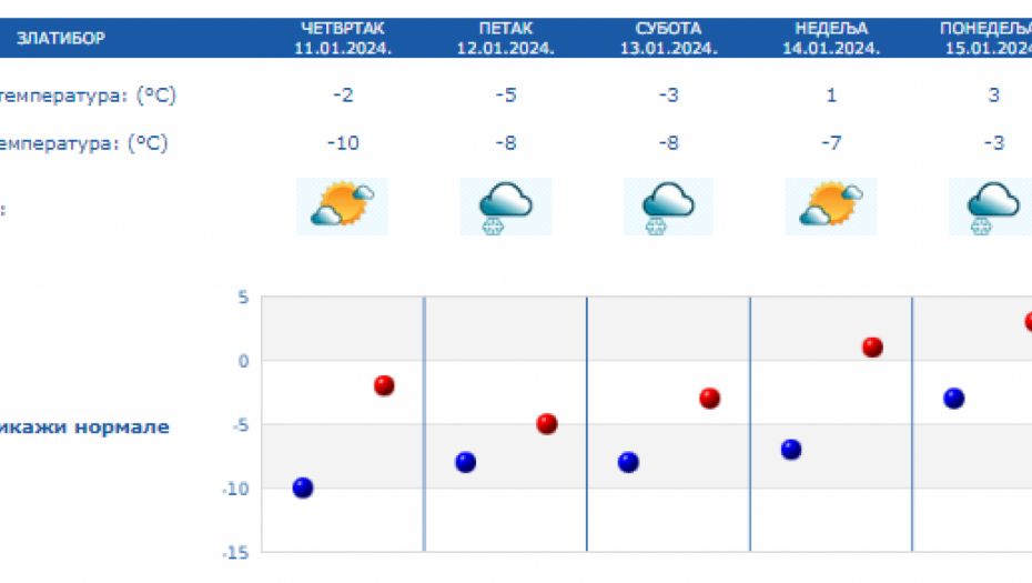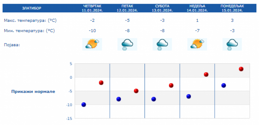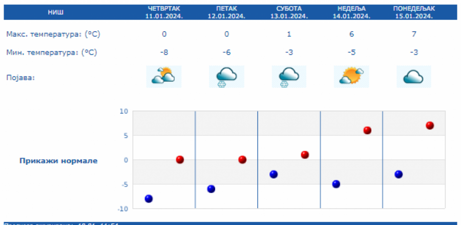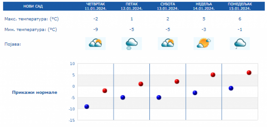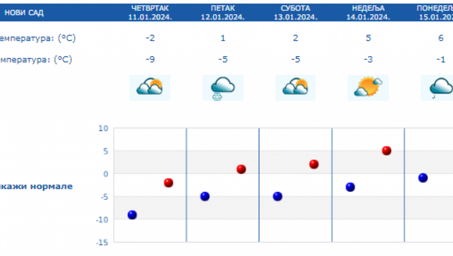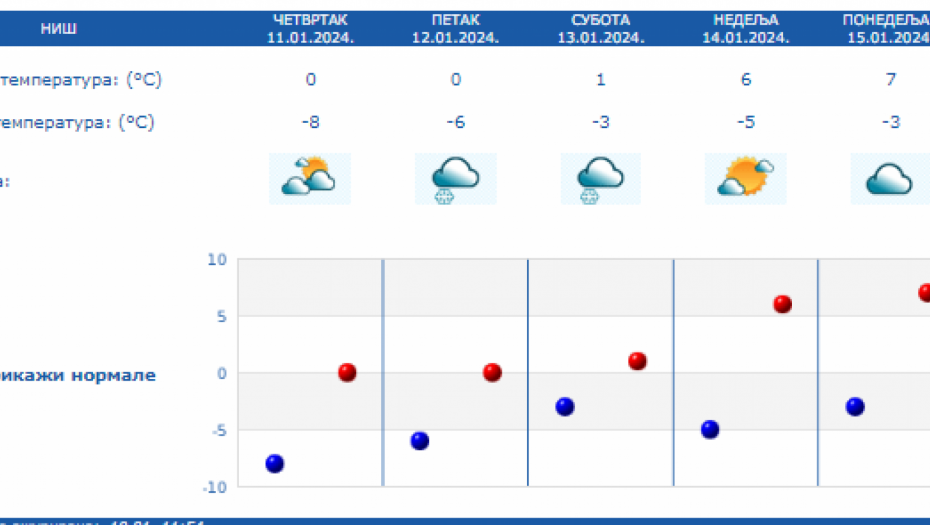 Danas najniža temperatura od -12 do -6 °C, najviša u većini mesta od -4 do 0 °C. Na severu Vojvodine, na jugu i istoku Srbije malo toplije, do 4 °C. Uveče na severu, a tokom noći i u ostalim krajevima naoblačenje, ponegde uz provejavanje slabog snega, a zapadni vetar biće u pojačanju, saopštio je Republički hidrometeorološki zavod.