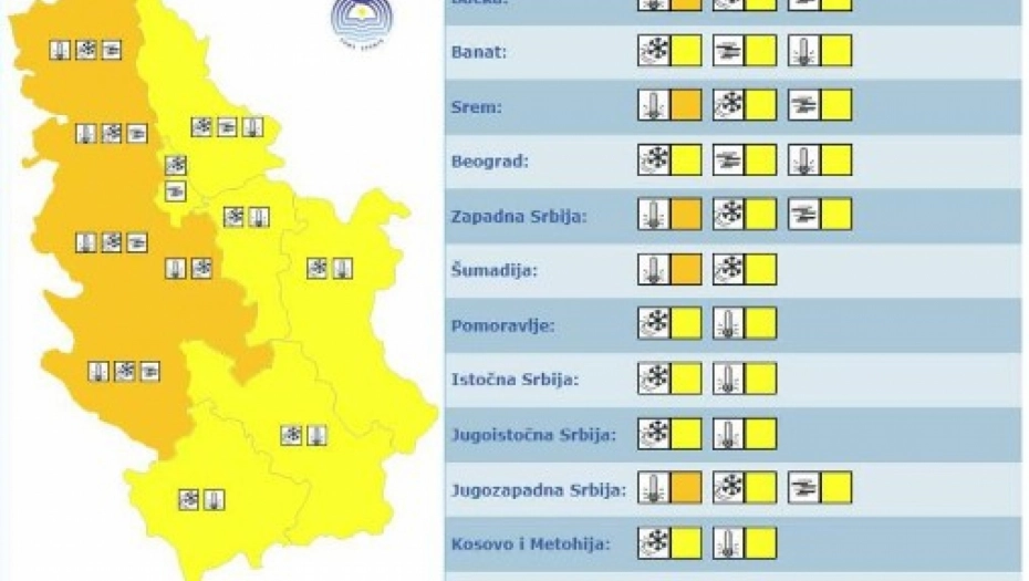 U Srbiji su danas na snazi dva meteoalarma, narandžasti i žuti. U Bačkoj, Sremu, Šumadiji, zapadnoj i jugozapadnoj Srbiji na snazi je narandžasto upozorenje zbog ekstremno niske temperature.