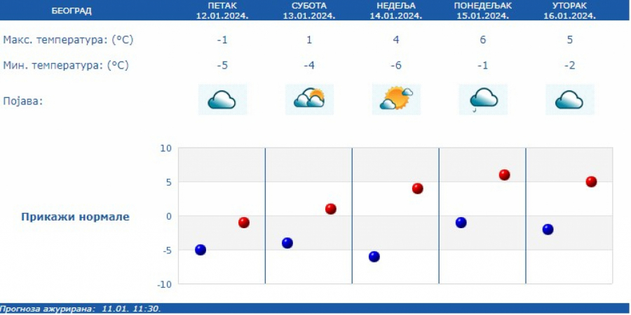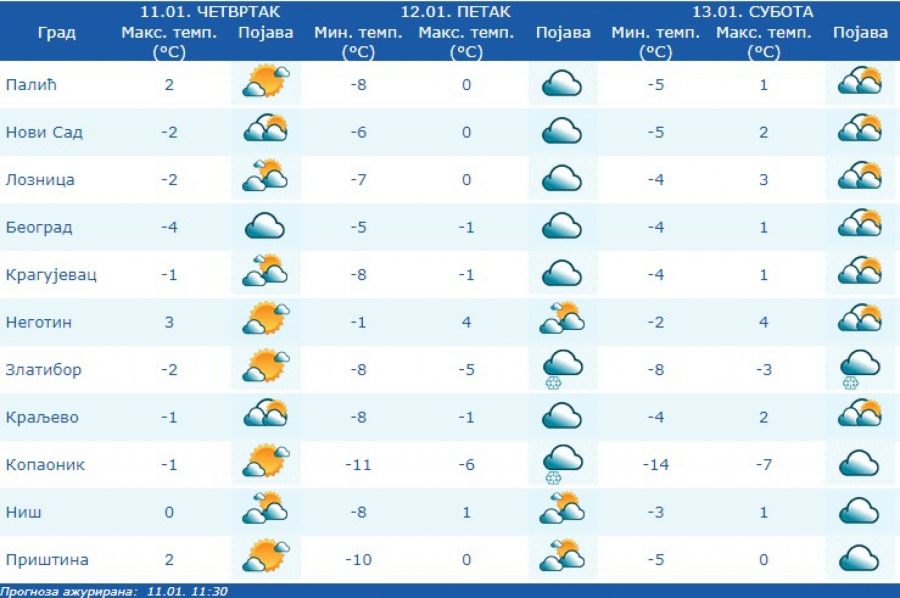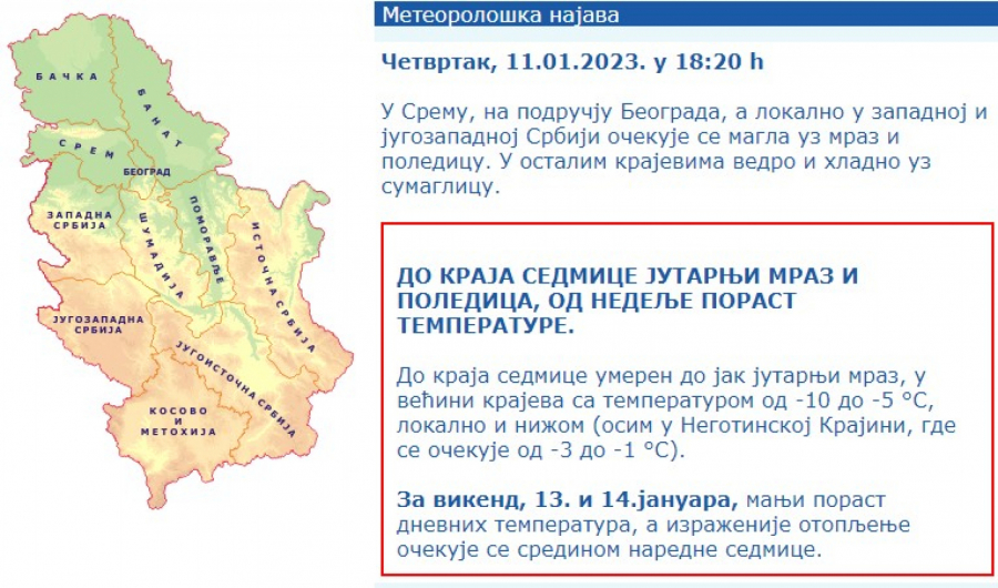 Vetar slab i umeren, u istočnoj Srbiji jak, zapadni i severozapadni. Najniža temperatura od -10 do -5 °C, lokalno i niža, a u Negotinskoj Krajini oko -1 °C. Najviša temperatura od -3 do 2 °C, u Negotinskoj Krajini oko 4 °C, saopštio je Republički hidrometeorološki zavod u novoj prognozi.