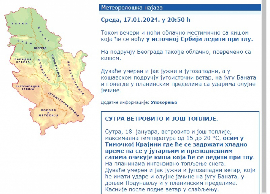 Osetno toplije uz umeren i jak južni i jugozapadni vetar koji će na jugu Banata, u donjem Podunavlju i u planinskim predelima imati i olujne udare, a kasnije posle podne biće u slabljenju.