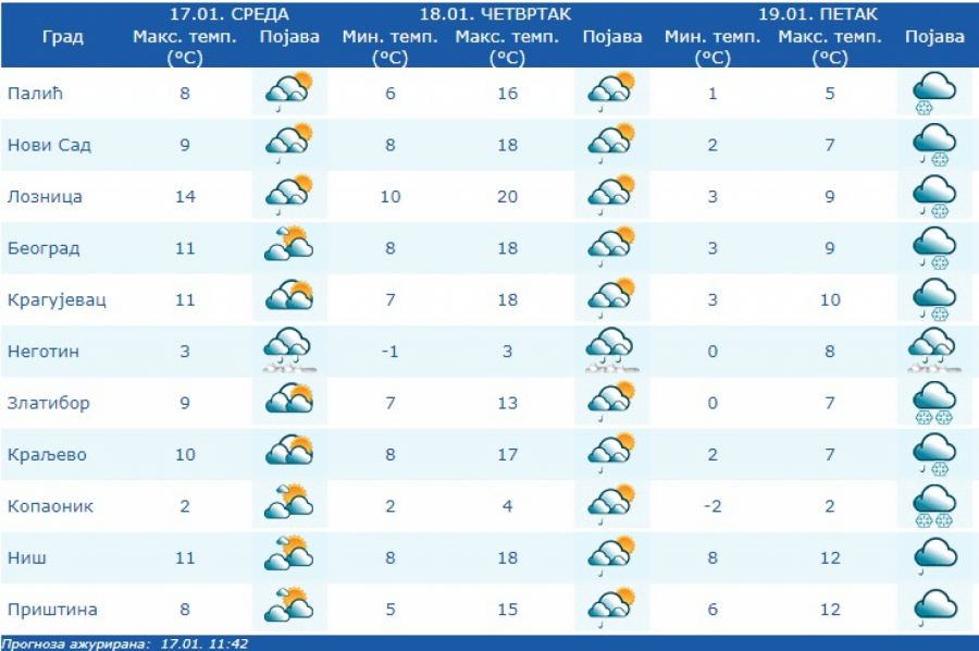 Tokom dana promenljivo, mestimično sa kratkotrajnom kišom ili pljuskovima. U istočnoj Srbije se ujutru i pre podne, očekuje kiša koja će se usled niskih temperatura lediti pri tlu.