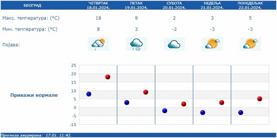 Duvaće umeren i jak severni i severozapadni vetar. Jutarnja temperatura od 5 do 9 °C, na istoku Srbije oko 0 °C, tokom dana temperatura u osetnom padu i posle podne će se kretati u intervalu od -1 na severu do 12 °C na jugu.