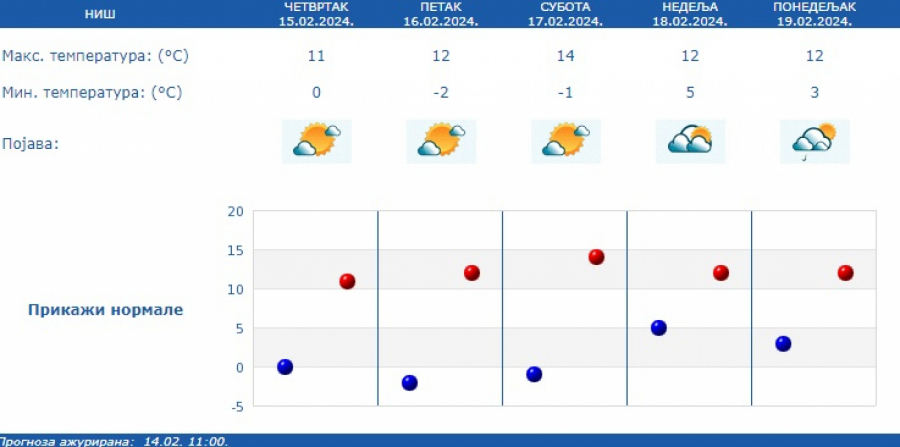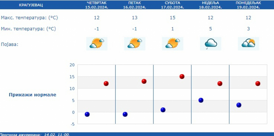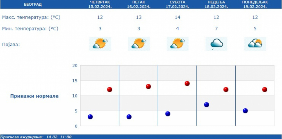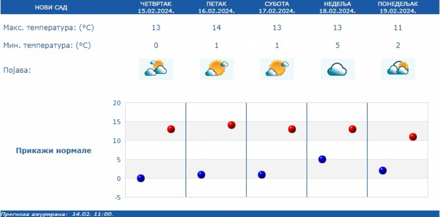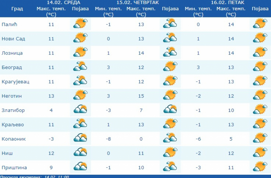 Kako je saopštio RHMZ, duvaće slab i umeren severozapadni vetar, uveče i tokom noći u skretanju na jugoistočni, a temperature će se kretati od minus jedan do 15 stepeni.