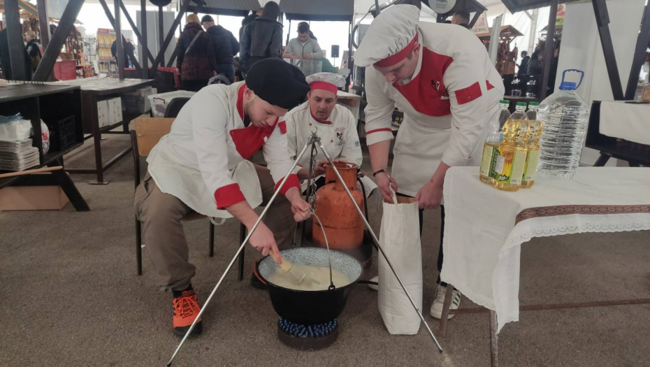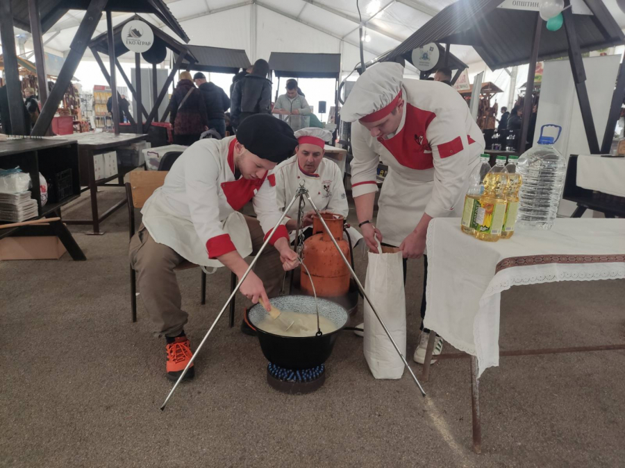 Na sajmu se kuvao kačamak, a profesor kuvarstva iz Ugostiteljsko-turističke škole Miroljub Mitrašinović, sa svoja dva učenika kuvao je doručak za posetioce.