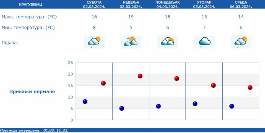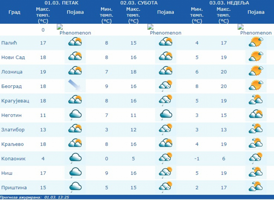 Po podne će se u Timočkoj Krajini zadržati oblačno vreme, u ostalom delu zemlje promenljivo sa dužim sunčanim periodima, a kratkotrajna kiša ili pljusak očekuju se u brdsko-planinskim predelima jugozapadne, južne, jugoistočne i istočne Srbije.