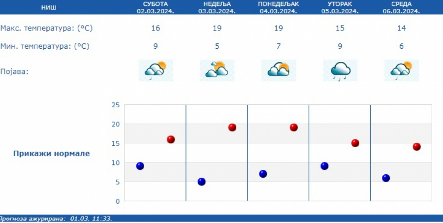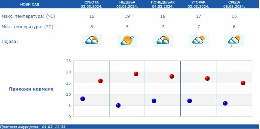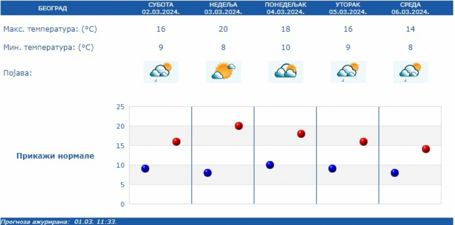 Prema prognozi za narednih sedam dana, do utorka će biti natprosečno toplo, u nedelju i ponedeljak promenljivo, uz smenu sunčanih i oblačnih intervala, dok se kratkotrajna kiša očekuje u brdsko-planinskim predelima istočne i južne Srbije, a u utorak i u ostalim krajevima.
