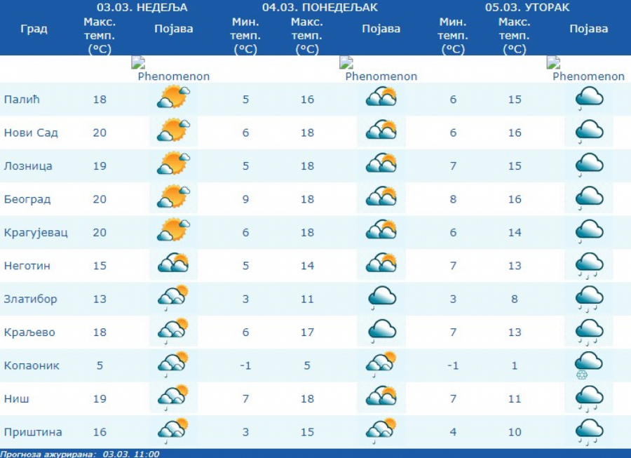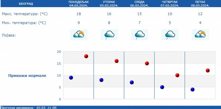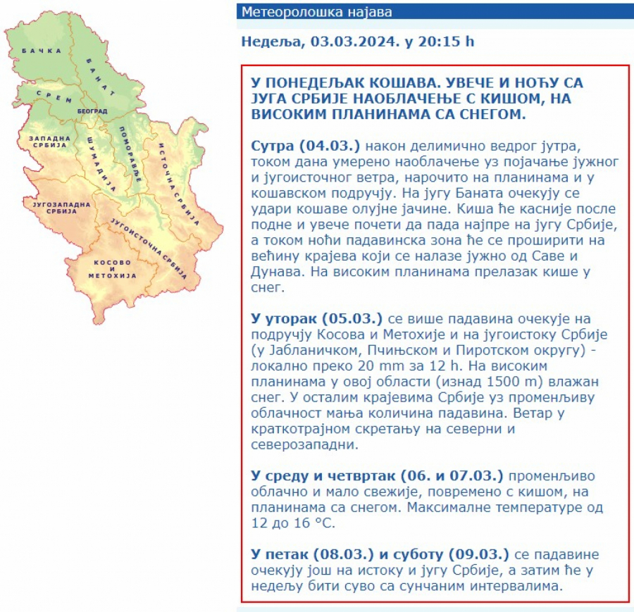 Prema izgledima vremena za narednih sedam dana, do ponedeljka, 11. marta, u utorak umereno do potpuno oblačno, mestimično s kišom, na planinama sa snegom, a obilnije padavine se očekuju na području Kosova i Metohije i na jugoistoku Srbije (u Jablaničkom, Pčinjskom i Pirotskom okrugu) - od 20 do 40 mm za 24 sata.