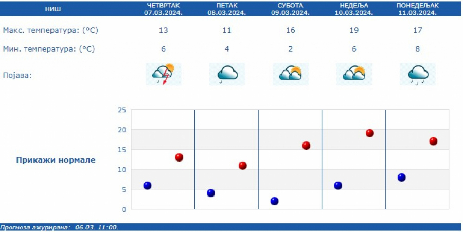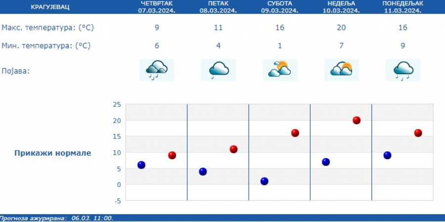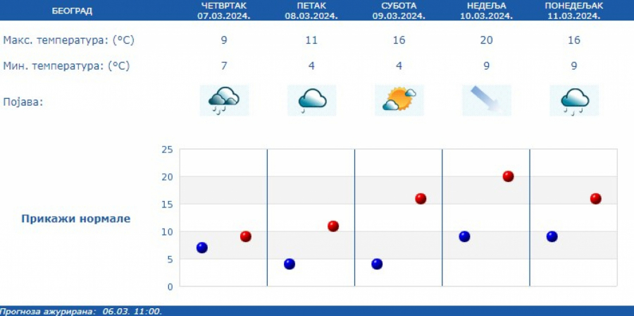 Kako se navodi u prognozi, pojava kiše biće učestalija u drugom delu dana, kada će lokalni pljuskovi biti praćeni i grmljavinom, a na planinama se očekuje sneg.