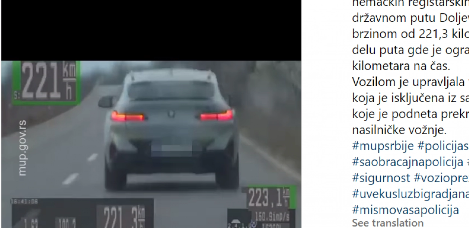 Vozilom je, navodi se u statusu, upravljala turska državljanka koja je isključena iz saobraćaja i protiv koje je podneta prekršajna prijava zbog nasilničke vožnje.