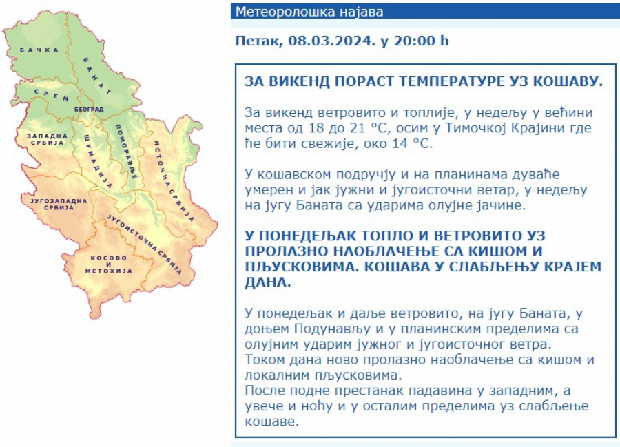 Duvaće slab i umeren, južni i jugoistočni vetar, koji će na jugu Banata biti umeren i jak, a temperature će se kretati od minus jedan do 15 stepeni.