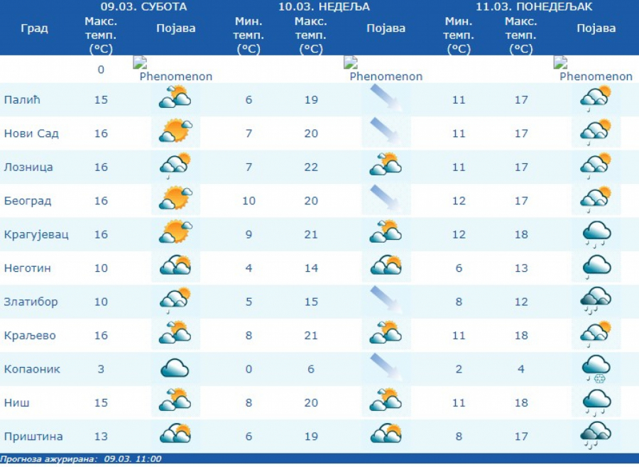 Krajem dana i u toku noći kiša je ponegde moguća i na istoku Srbije. Na planinama i u košavskom području duvaće jak južni i jugoistočni vetar, na jugu Banata sa udarima olujne jačine.