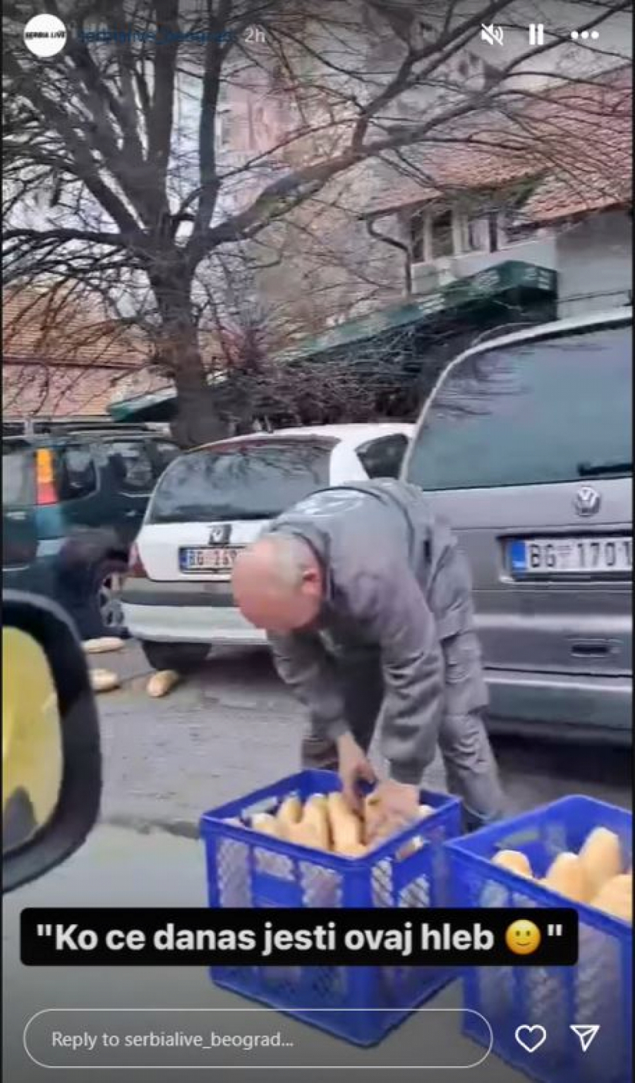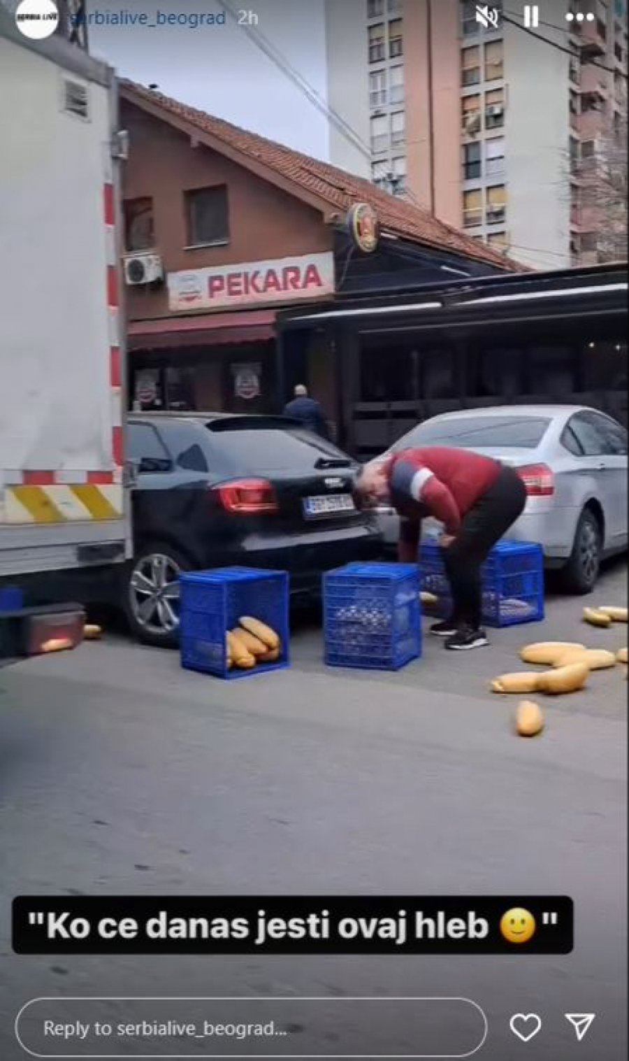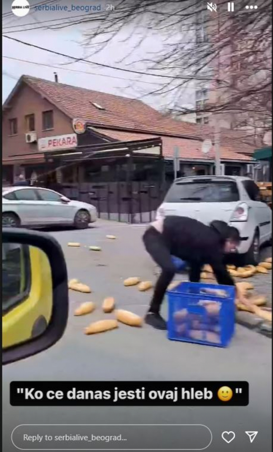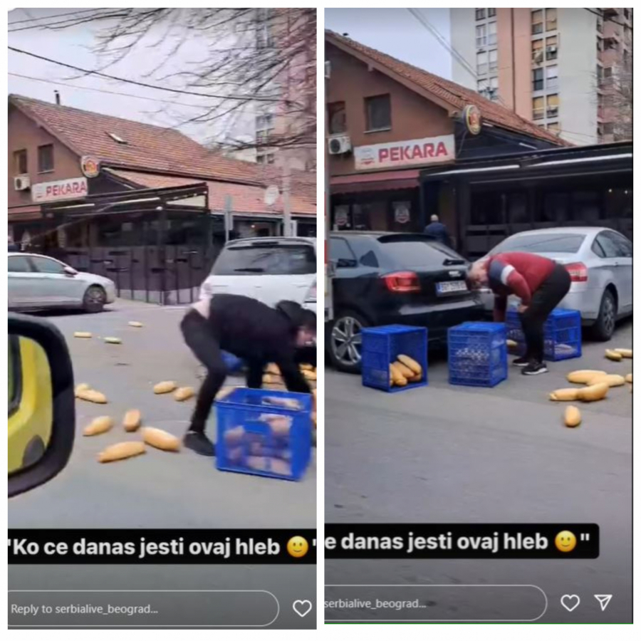 Snimak koji je objavljen na Instagram stranici "serbialive-beograd" nastao je u Zemunu, a na njemu se vidi nekoliko korpi za hleb i više vekni koje su rasute po ulici.