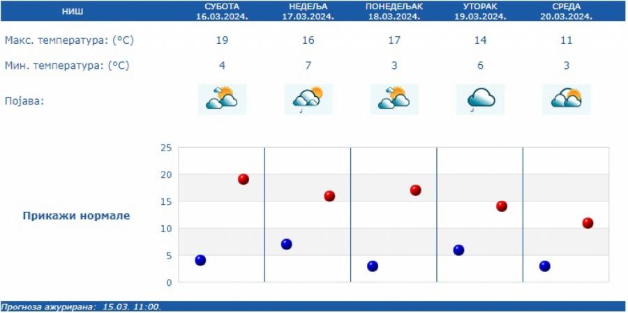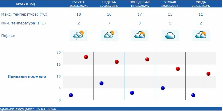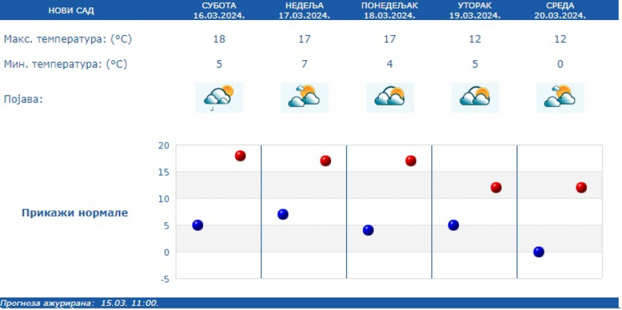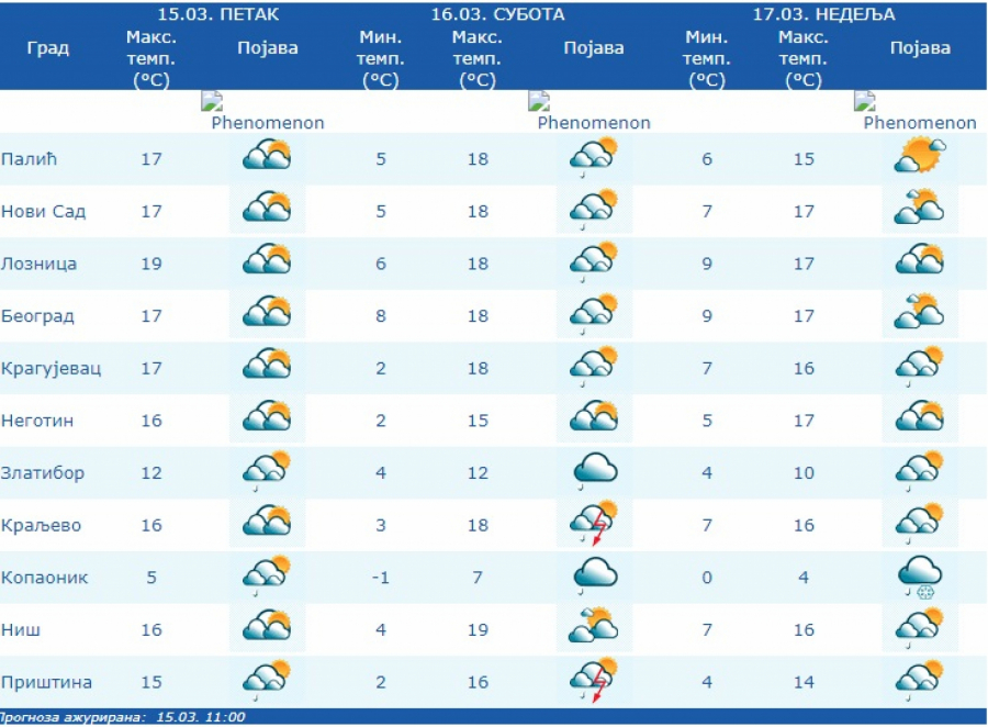 Duvaće slab i umeren jugoistiočni vetar, sa temperaturama od jedan do 19 stepeni.