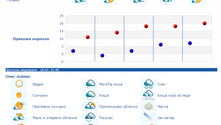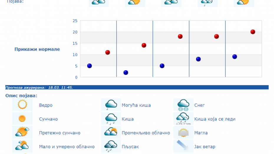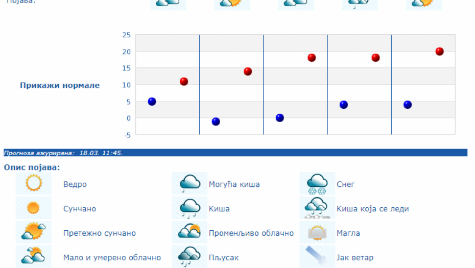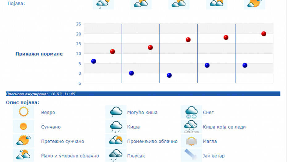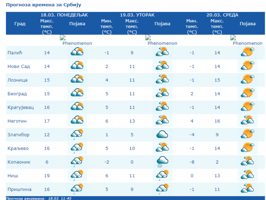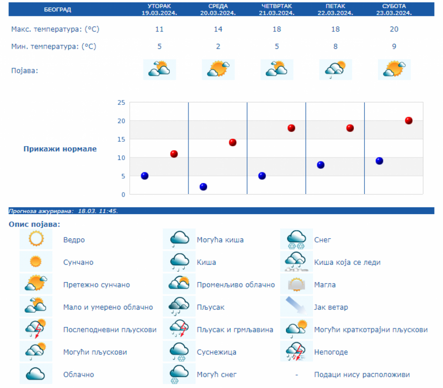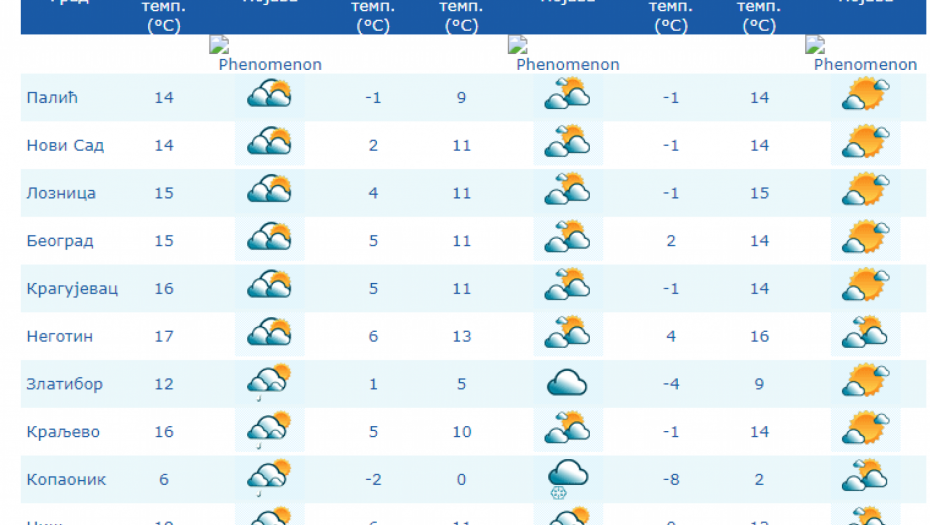 Najniža temperatura od 5 do 10, a najviša od 13 do 17 stepeni. U Beogradu ujutru prestanak kiše. Pre podne razvedravanje, od sredine dana pretežno sunčano. Vetar slab i umeren, kratkotrajno i jak severozapadni, uveče u slabljenju.