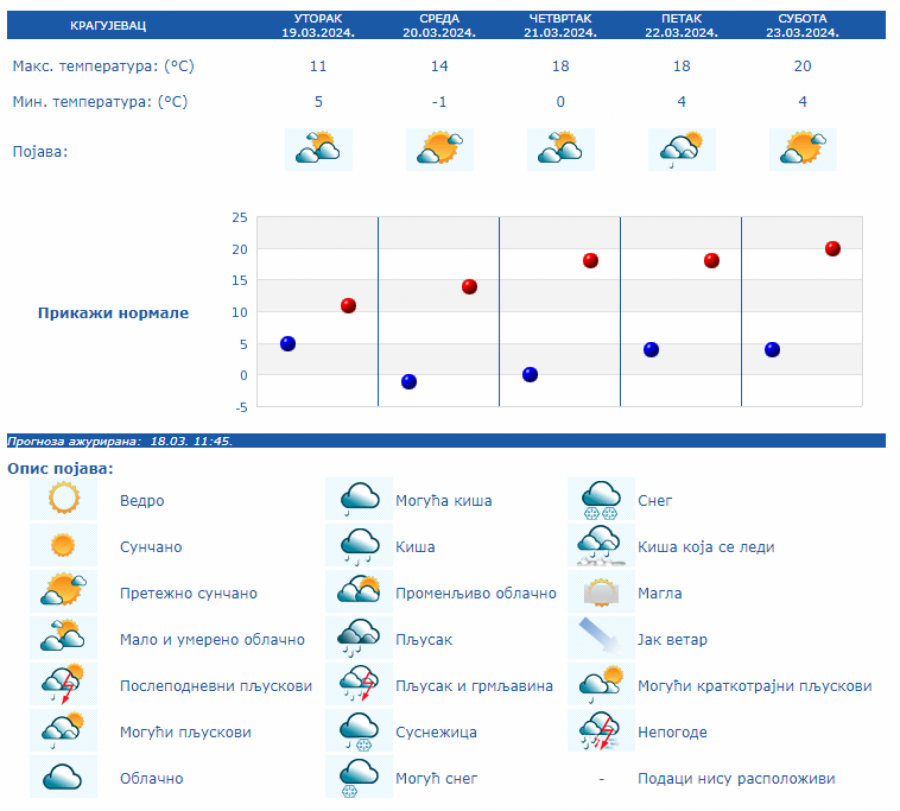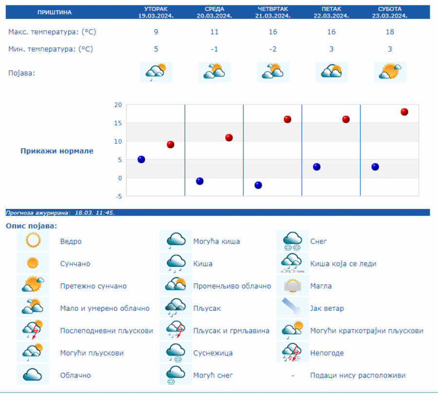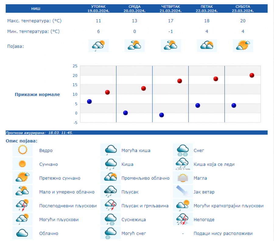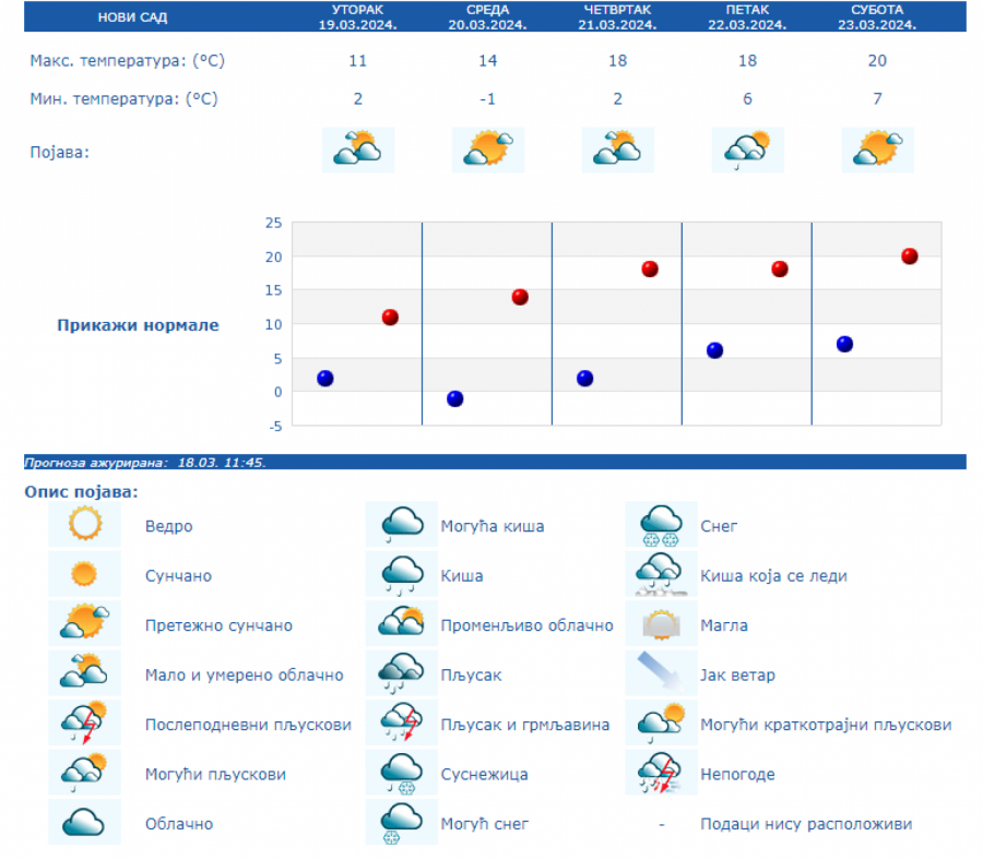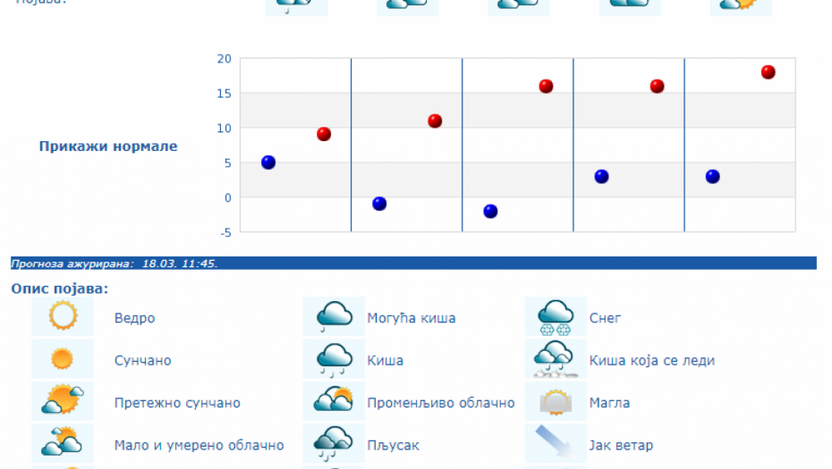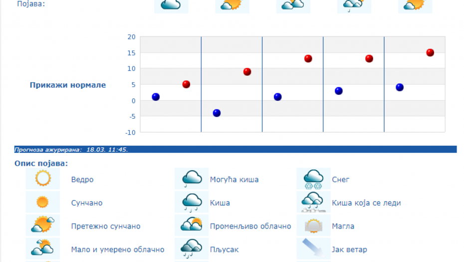 Najniža temperatura od 5 do 10, a najviša od 13 do 17 stepeni. U Beogradu ujutru prestanak kiše. Pre podne razvedravanje, od sredine dana pretežno sunčano. Vetar slab i umeren, kratkotrajno i jak severozapadni, uveče u slabljenju.