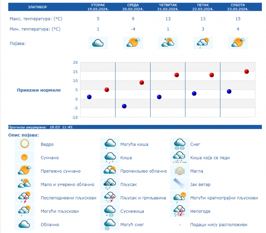 Prema izgledima za narednih sedam dana, u ponedeljak i utorak se očekuje promenljivo oblačno ponegde sa kratkotrajnom kišom ili lokalnim pljuskom, na visokim planinama sa snegom. U sredu i četvrtak ujutru ponegde slab mraz, tokom dana pretežno sunčano uz malu do umerenu oblačnost. U petak i za vikend prolazna naoblačenja koja će ponegde usloviti kratkotrajnu kišu ili pljusak.