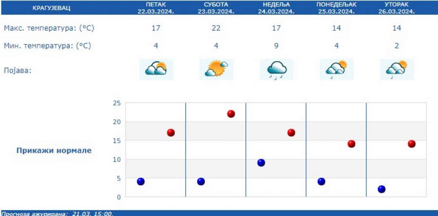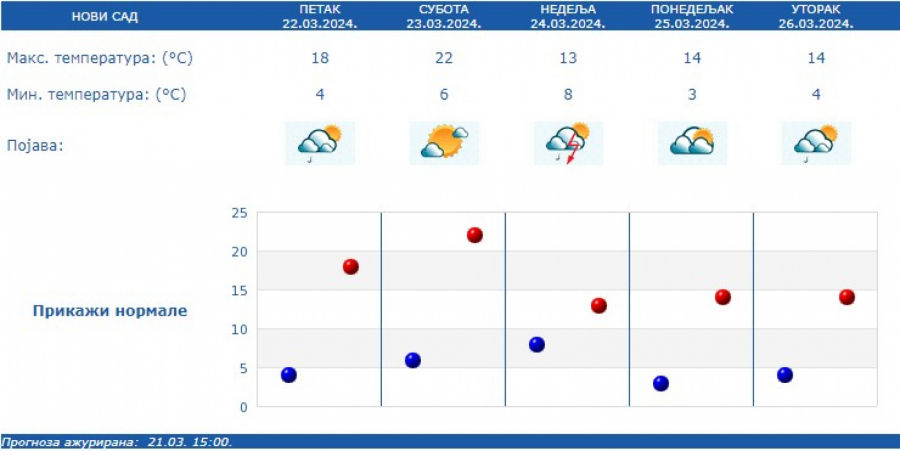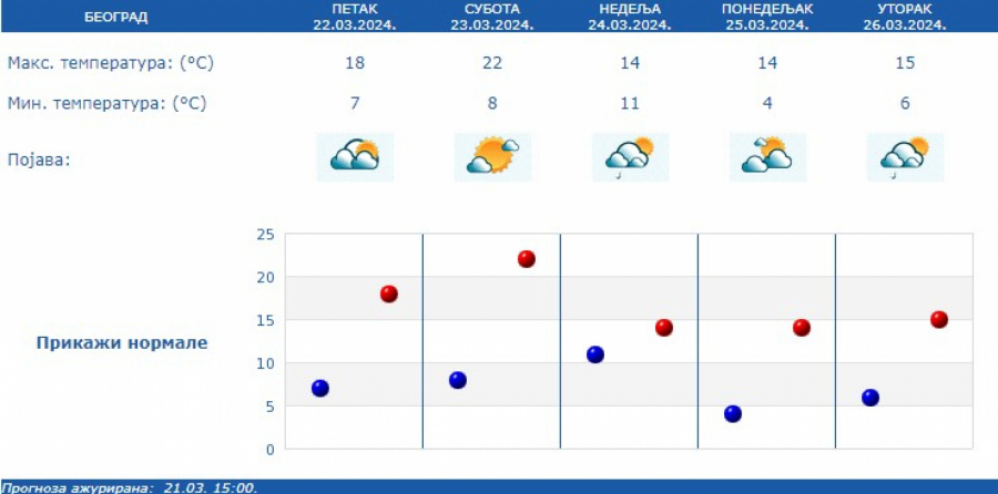 Od utorka vetrovito, uz porast temperature. Duvaće umeren i jak, južni i jugoistočni vetar, naročito na planinama i u košavskom području, a prolazna naoblačenja sa kišom i pljuskovima očekuju se u utorak i četvrtak.