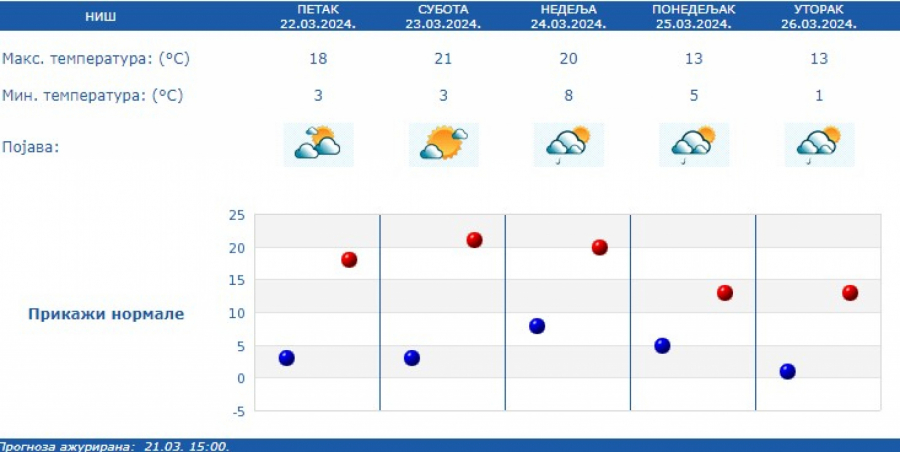 U ponedeljak, 25. marta promenljivo oblačno sa dužim sunčanim intervalima i tek ponegde s kratkotrajnom kišom, na planinama sa kratkotrajnim snegom.