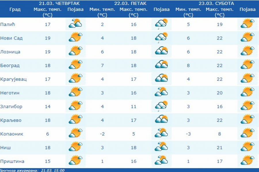 U Srbiji u subotu pretežno sunčano i toplo, a maksimalna temperatura u većini mesta od 20 do 22 stepena.