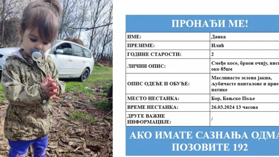 Devojčica Danka Ilić (2) iz Bora nestala je juče oko 13.45 u naselju Banjsko polje. Potraga za nestalim detetom trajala je tokom cele noći.