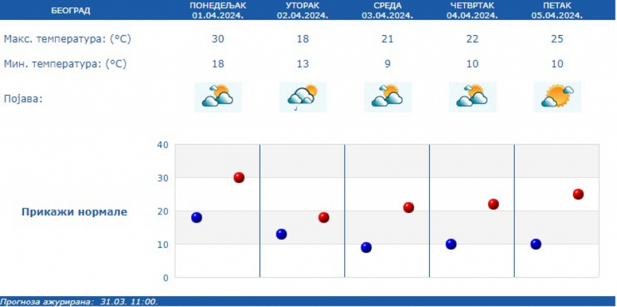 U sredu umereno oblačno i suvo sa sunčanim intervalima, a tokom noći ka četvrtku i u četvrtak prolazno naoblačenje ponegde sa kišom ili kratkotrajnim pljuskom.