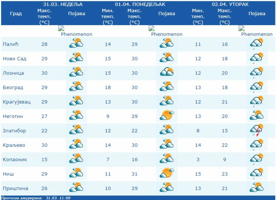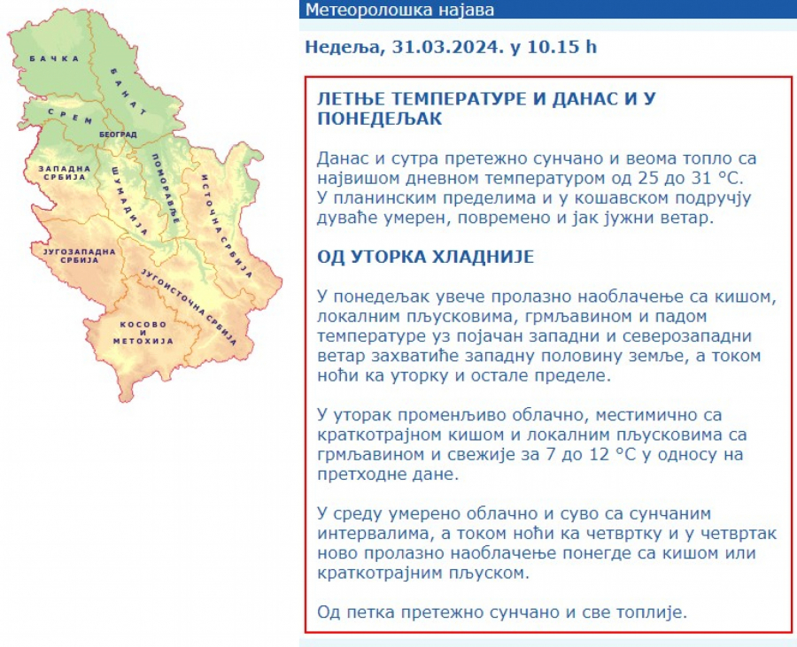Uveče na zapadu i jugozapadu Srbije, a noću i u ostalim krajevima prolazno naoblačenje sa kišom i lokalnim pljuskovima sa grmljavinom, uz skretanje vetra na zapadni i severozapadni pravac.