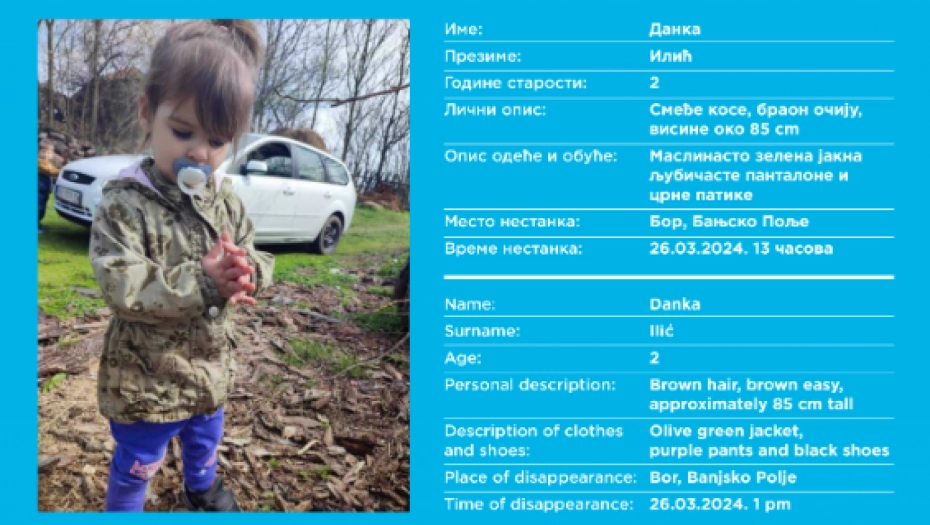 - Devojčica Danka Ilić nestala je 26.3.2024. godine iz Bora u Srbiji, a ovaj grad nalazi se u blizini granice sa Rumunijom i Bugarskom. Treba napomenuti da devojčica nije razvila moć govora - navodi se na pomenutom sajtu.