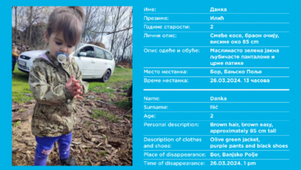 Podsetimo, dvogodišnja Danka Ilić nestala je u prošlog utorka oko 13:45, i u trenutku nestanka na sebi je imala ljubičaste pantalone, maslinasto zelenu jaknu i kosu vezanu u rep.