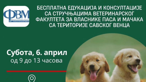 Gradska opština Savski venac u saradnji sa Fakultetom veterinarske medicine organizuje u subotu, 6. aprila, od 9 do 13 časova, besplatnu edukaciju i konsultacije za vlasnike pasa i mačaka sa teritorije opštine u parku Manjež. Zainteresovani sugrađani biće u prilici da u razgovoru sa stručnjacima veterinarske medicine dobiju korisne savete i odgovore na pitanja koja se tiču brige o zdravlju njihovog ljubimca. Prilikom dolaska potrebno je poneti pasoš za psa ili mačku. Edukativne aktivnosti i konsultacije sa stručnjacima u narednom periodu će biti organizovane i u drugim parkovima na Savskom vencu.