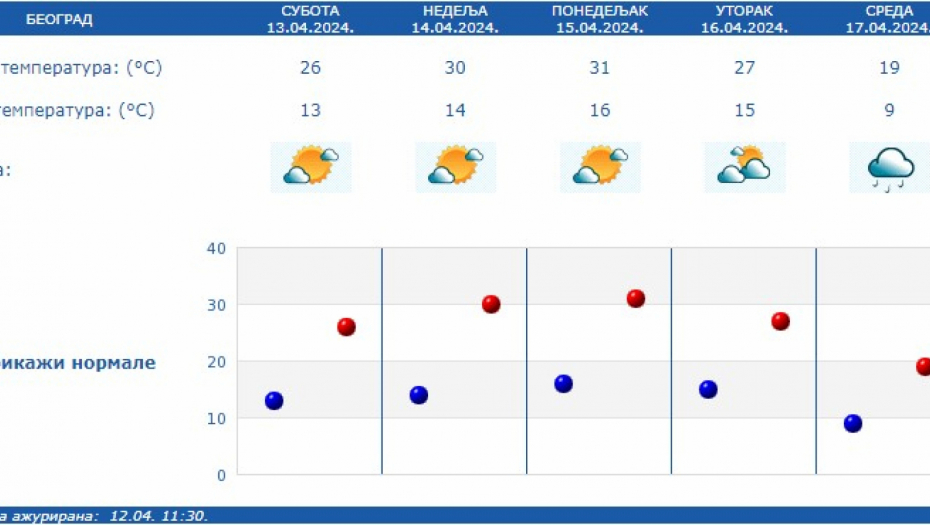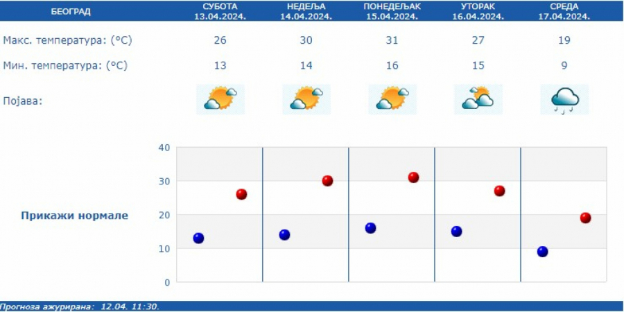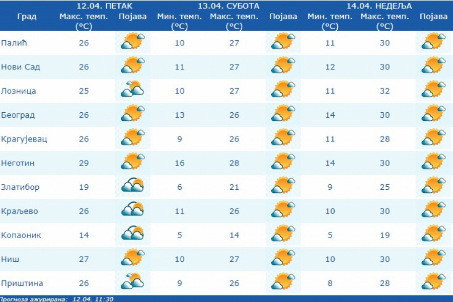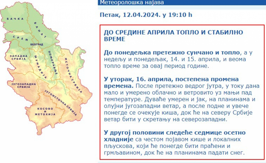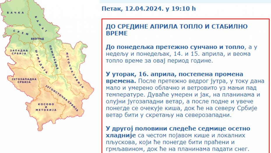 U Srbiji u nedelju i ponedeljak pretežno sunčano i veoma toplo. U utorak, 16. aprila, postepena promena vremena, pa će, posle pretežno vedrog jutra, u toku dana biti malo i umereno oblačno i vetrovito, uz manji pad temperature.