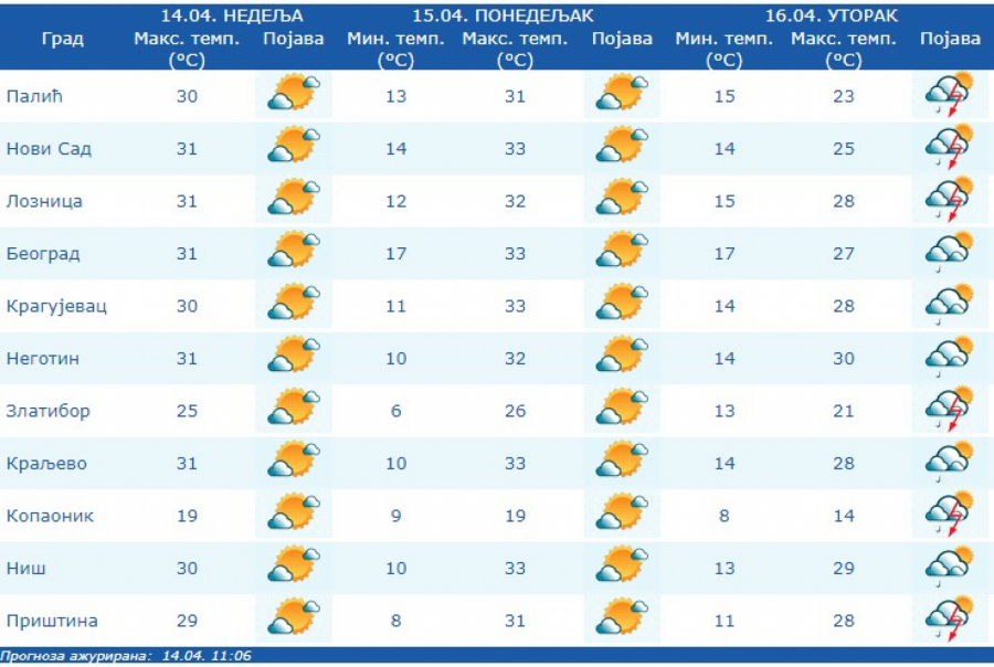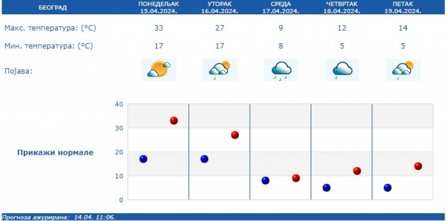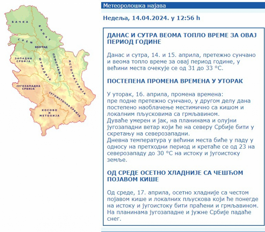 Duvaće umeren i jak, na planinama i olujni jugozapadni vetar koji će na severu Srbije biti u skretanju na severozapadni. Dnevna temperatura biće u postepenom padu i kretaće se od 23 na severozapadu do 30 stepeni na istoku i jugoistoku zemlje.