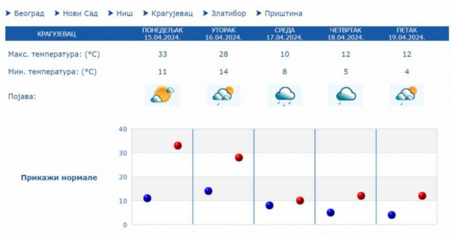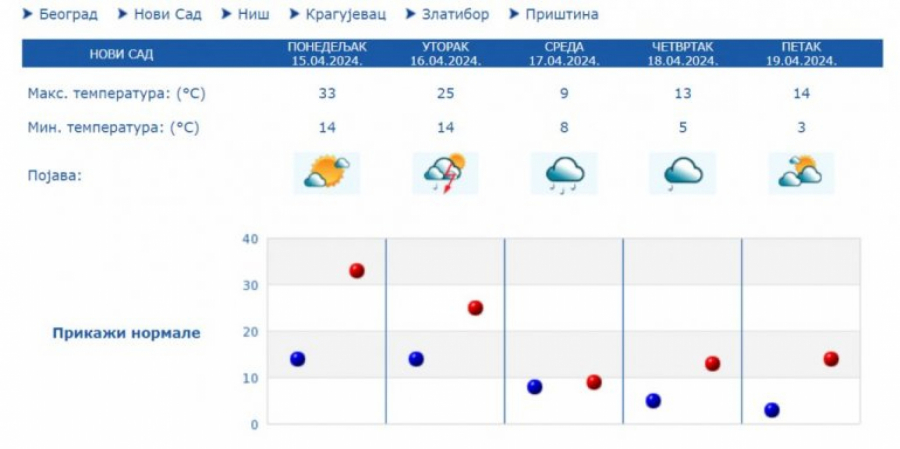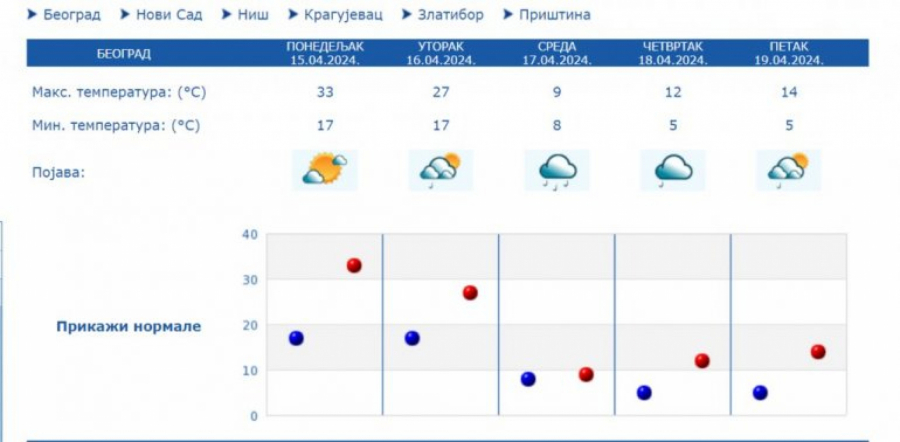 Prosečna maksimalna temperatura za ovo doba godine u Srbiji je od 15 do 20 stepeni, tako da će narednih dana temperature biti i za 15 stepeni više od proseka.
