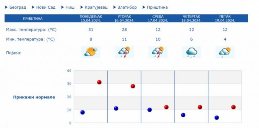 U sredu oblačno sa kišom i pljuskovima sa grmljavinom. Maksimalna temperatura biće od 12 u Bačkoj do 24 stepena na jugoistoku Srbije.