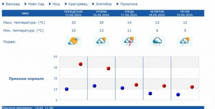 Maksimalna temperatura biće od 8 do 14 stepeni Celzijusa. Dakle, u drugoj polovini sledeće sedmice u delovima Srbije temperature će biti niže za 20 stepeni u odnosu na prethodne dane.