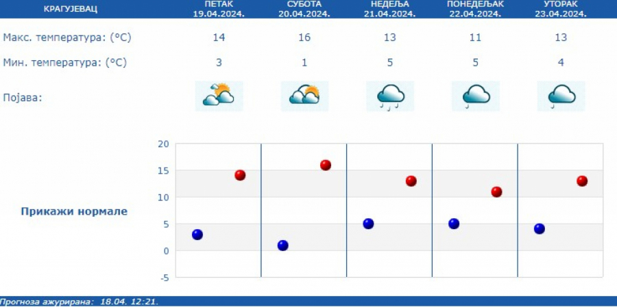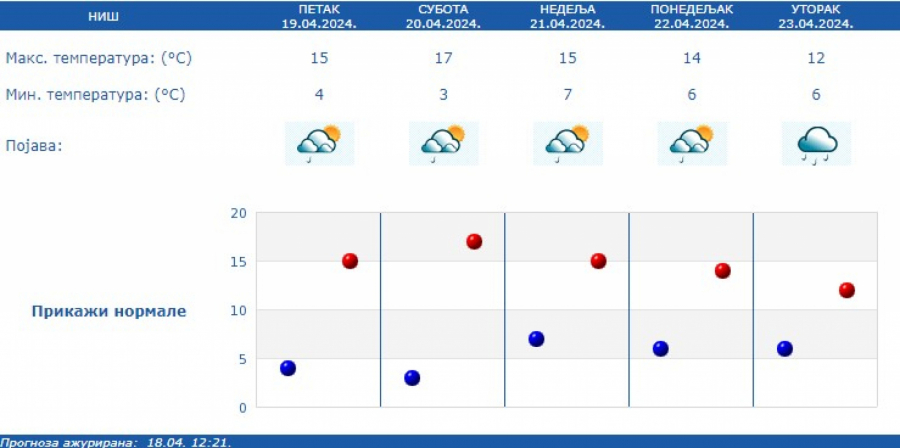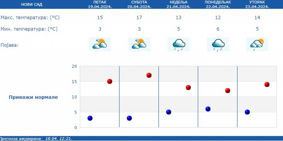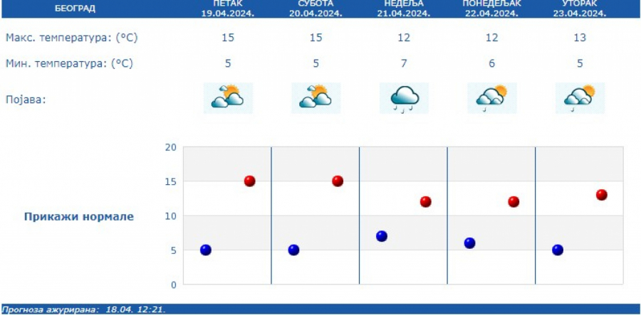 Zatim nas očekuje umereno do potpuno oblačno i ponovo hladnije vreme s dnevnom temperaturom malo ispod proseka za ovaj period godine, mestimično s kišom i lokalnim pljuskovima.