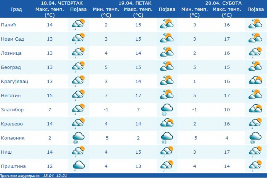 Tokom dana biće malo toplije, pre podne pretežno sunčano, posle podne uslediće postepeno naoblačenje, kasnije posle podne s kišom u južnim, uveče i u centralnim, a tokom noći i u većini ostalih predela Srbije.