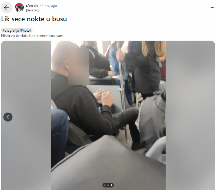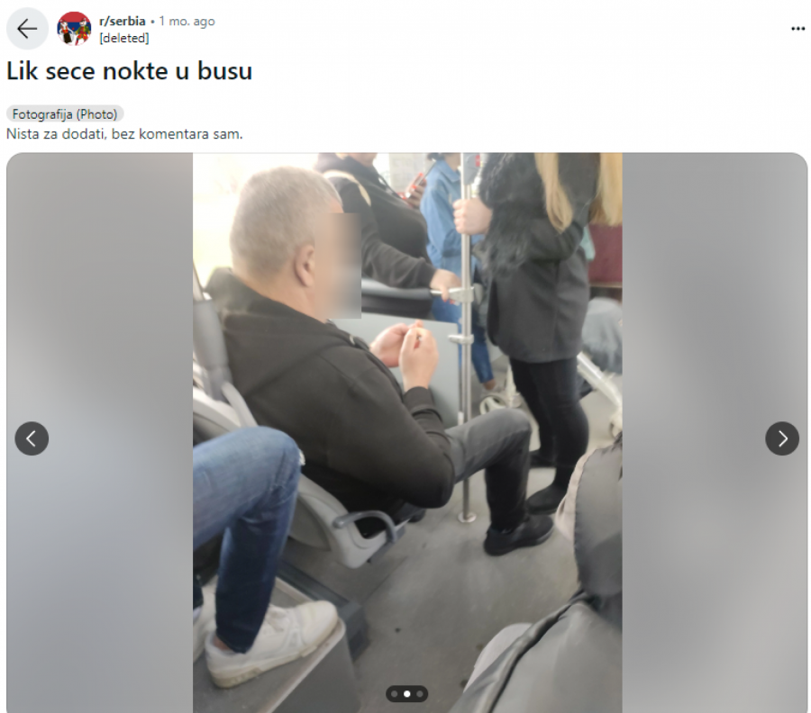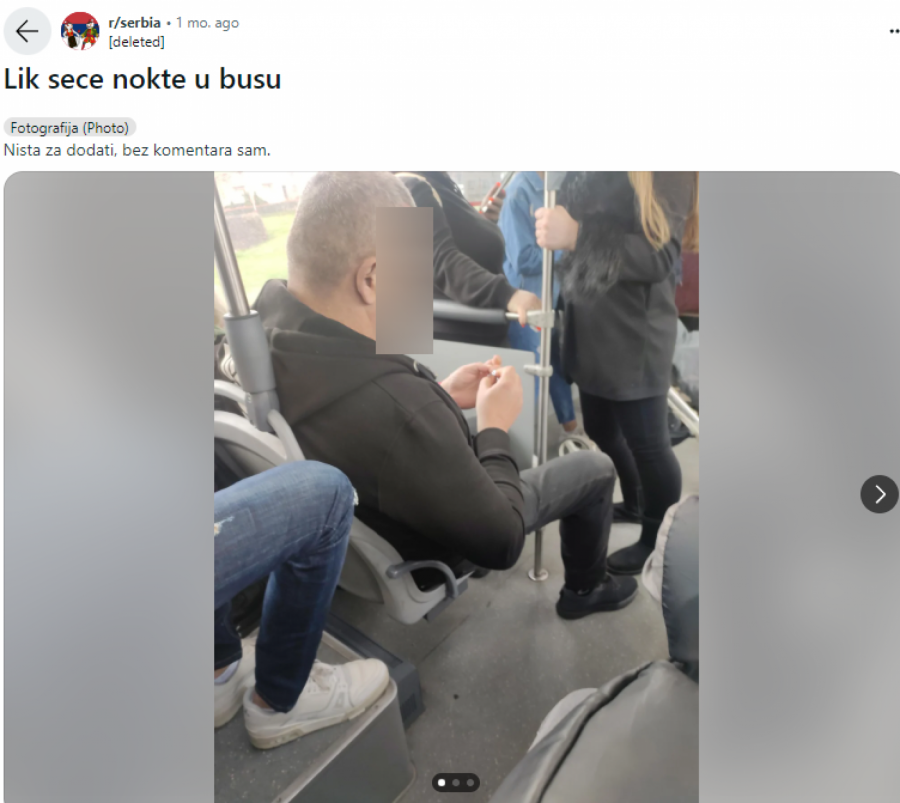 Jedan korisnik podelio je fotografije muškarca koji dok se vozi u autobusu nonšalantno seče nokte naočigled svih putnika.