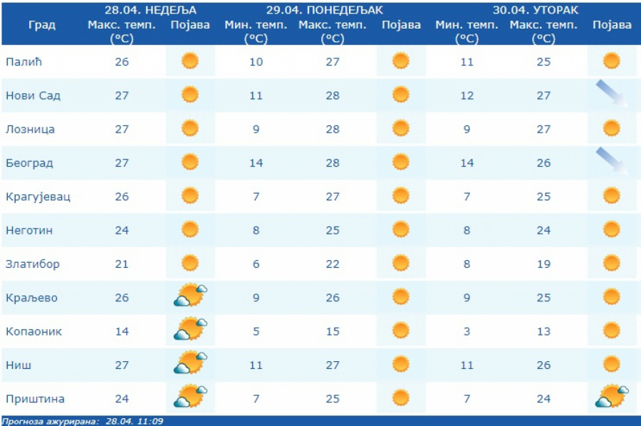 Najniža temperatura od 4 stepena po pojedinim kotlinama jugozapadne Srbije do 17 stepeni na jugu Banata, najviša od 25 do 28 stepeni Celzijusa.