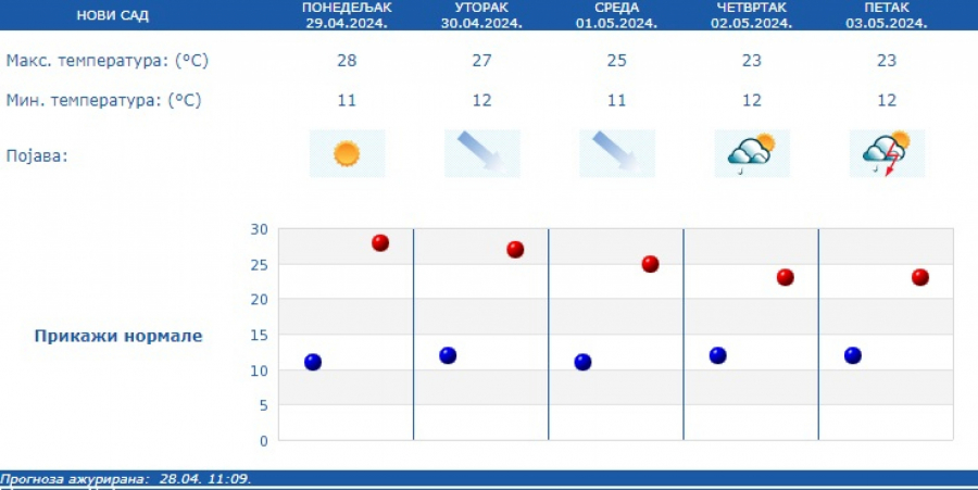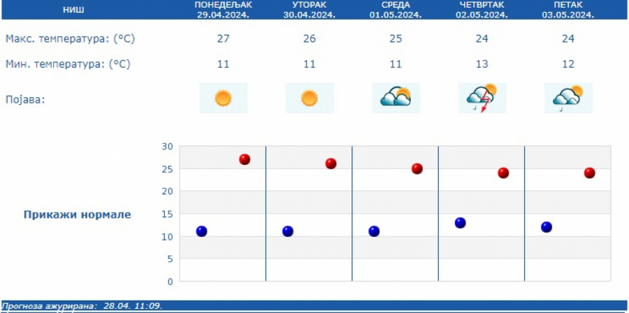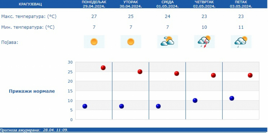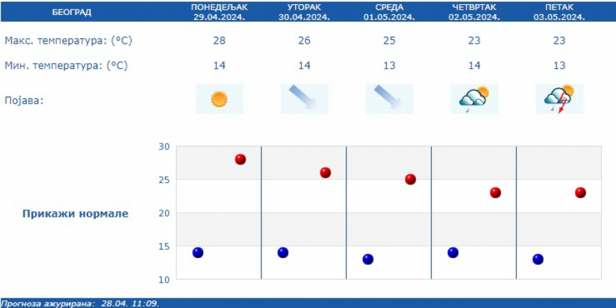 U sredu, 01. maja, u brdsko-planinskim, a od četvrtka, 02. maja, i u ostalim krajevima promenljivo i nestabilno, povremeno sa kišom i lokalnim pljuskovima sa grmljavinom, uz postepeni pad dnevne temperature.